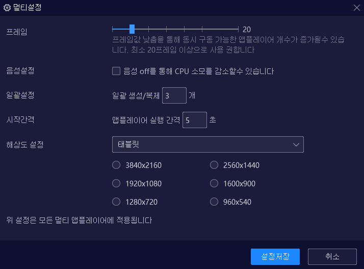 멀티 설정은 CPU 사용을 많이 하므로 프레임 값을 낮춰주어서 사용하는게 좋습니다.