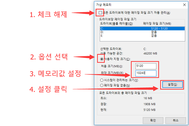 > 가상메모리 탭에서 아래 순서대로 설정하고 컴퓨터 재부팅