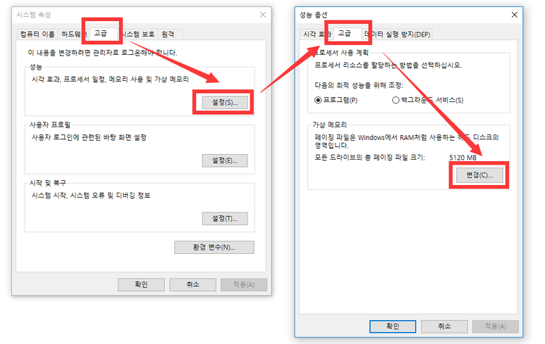 > (시스템 속성) 고급 - 설정 - (성능 옵션) 고급 - (가상메모리) 변경