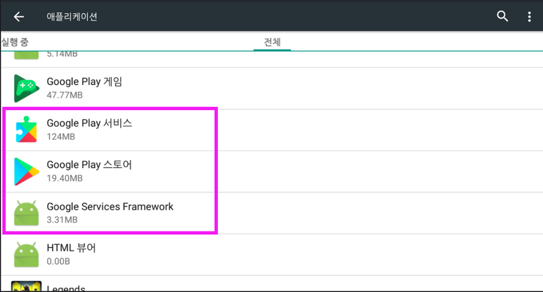 2. 애플리케이션관리 > 플레이 스토어 > "데이터 삭제", "업데이트 제거" 작업 실행,